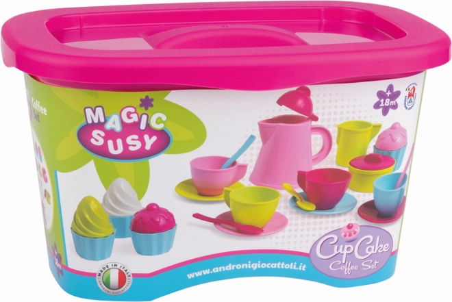 Et stilfuldt kaffebordsæt fra Androni forvandler ethvert legekøkken til en lille café. Sættet rummer alt til baristaleg – fra kande og kopper til søde cupcakes – og er fremstillet i Italien af kvalitetsplast, der er robust og fleksibel. Med 24 dele, en praktisk opbevaringsboks med låg og et sikkert design er det ideelt til børn fra 18 måneder og også til børnehaver.
