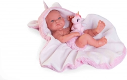 Håndlavet spansk dukke – baby med helvinylkrop og realistiske detaljer, inklusive anatomisk korrekt gengivelse. Af blødgjort vinyl, behagelig at røre ved, egnet til badning. Størrelse 42 cm, gaveæske, alder 3+.