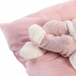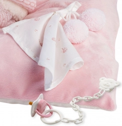 Dukken kommer klædt i lyserødt strikset med hue og sko for et realistisk look under leg.
