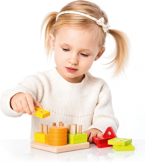 Den didaktiske legetøjsserie CUBIKA Sortér former indeholder 16 farvede, perforerede geometriske dele samt en solid kvadratisk base med pinde. Børn opdager naturligt forskelle mellem former og farver, træner greb og hånd–øje-koordination og udvikler fantasi og tålmodighed. Omhyggelig udførelse i ahorn- og bøgetræ samt holdbare, sundhedsmæssigt ufarlige vandbaserede farver sikrer lang levetid og sikker leg.