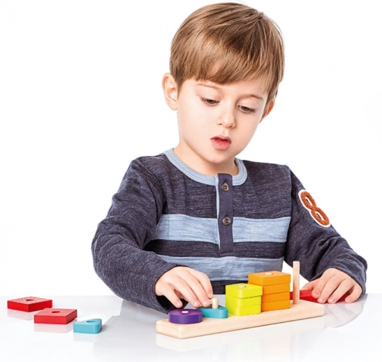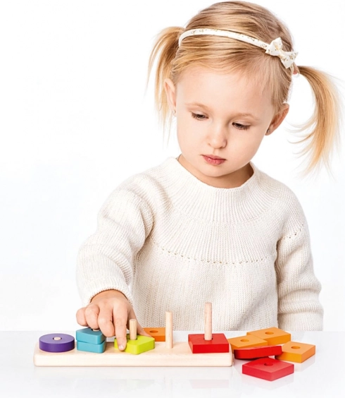 At trække formerne ned over pindene styrker hånd-øje-koordination, tålmodighed og koncentration – en ideel aktivitet for børn fra 18 måneder.
