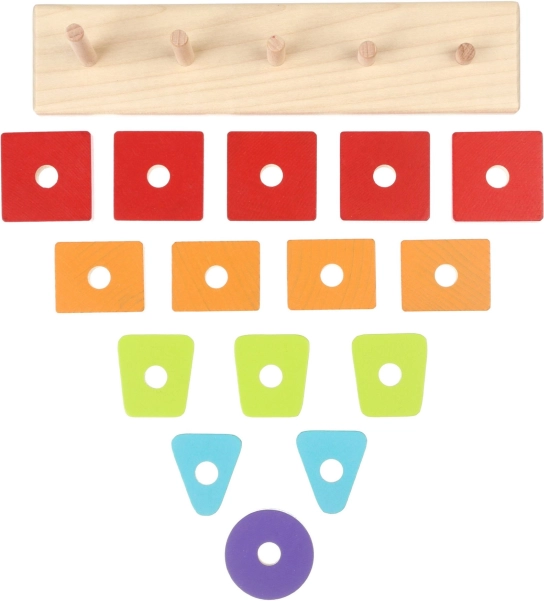 Takket være de forskellige geometriske brikker og gentagende farver lærer børn nemt at sortere, parre og placere korrekt på basens pinde.