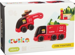 Træsættet CUBIKA brandmænd indeholder en brandbil og en helikopter lavet af kvalitetsløn og bøg. Takket være de afrundede kanter og sikre vandbaserede farver er det ideelt til børn fra 3 år. Certificeringerne TÜV og den europæiske standard EN 71 garanterer høj sikkerhed. Fremstillet i Europa. Længde på bil 12 cm, helikopter 10 cm.