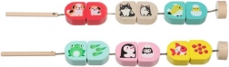At træde træbrikkerne på snoren er lettere takket være træpinden. Børn øver gribefærdighed, præcision og tålmodighed, når de sammensætter dyrepar.