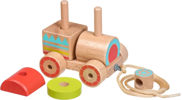 Det trækkende trætog kombinerer klassisk udseende og moderne læringselementer. Børnene placerer farvede dele de rigtige steder, træner greb og udforsker grundlæggende former og farver. Når det er samlet, kan toget nemt trækkes med snoren og dermed udvikle gangkoordineringen.