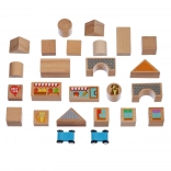 Byg din egen maleriske lille by af omhyggeligt bearbejdede træklodser, og tag på tur med to små biler. De forskellige former – klodser, trekanter, cylindre og broer – kombineres flot og motiverer børn til kreativ byggeleg og fri leg.