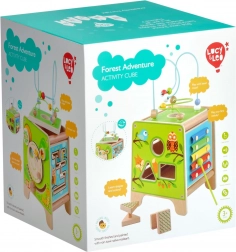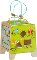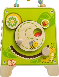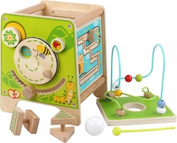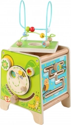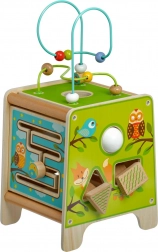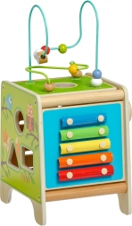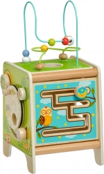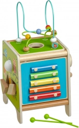 Denne farverige træ-aktivitetskube giver børn timevis af meningsfuld leg. Den øverste perlelabyrinth kan tages af og vendes ned i kuben for nem opbevaring. På siderne finder børn en xylofon med køller, en formsortering med todelte roterende geometriske figurer, et motorisk labyrintspor, et roterende hjul, drejeelementer og et sjovt spor med en pind, der skubbes gennem en rille.