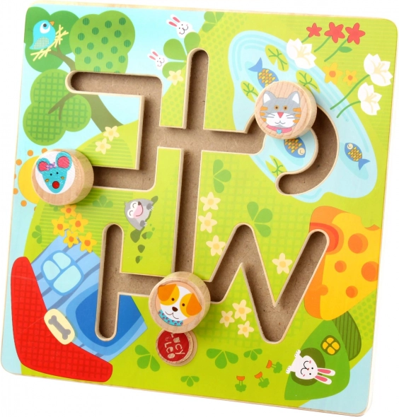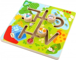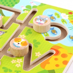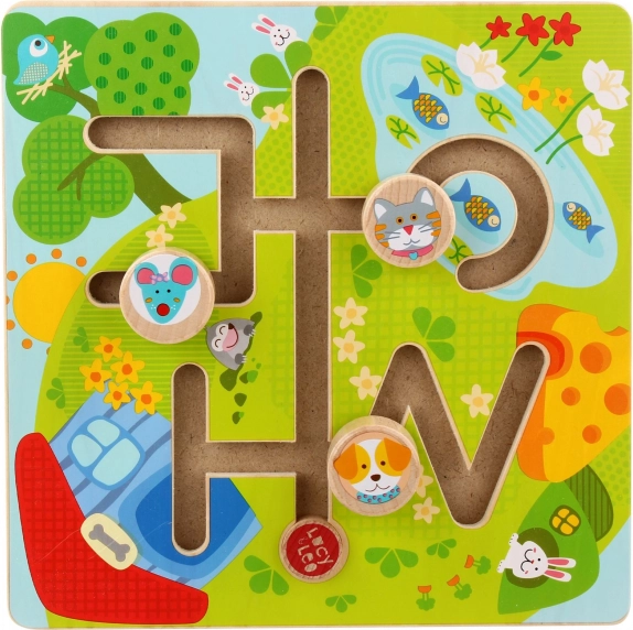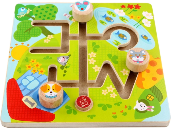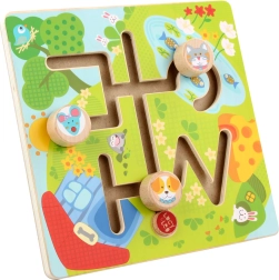 Trælabyrinten Solrige Dal giver børn glæden ved at udforske og lære. Den illustrerede spilleplade med dam og grønne områder suger børnene ind i legen, hvor hund, kat og mus bevæger sig mod deres mål. Takket være de flydende riller glider figurerne let, og legen er derfor sikker og intuitiv.