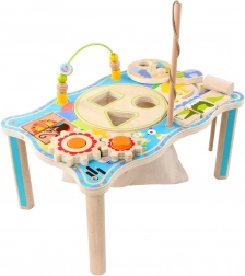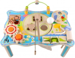 Træbordet med junglemotiver forener leg og læring og styrker finmotorik, hånd–øje-koordination og logisk tænkning. Børn kan dreje tandhjul, flytte perler på banen, træne styrke og fokus med bankesættet og øve formgenkendelse med formsortereren. I midten er der en linnedpose til fangede fisk og spillebrikker, som holder legeområdet ryddeligt.