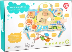 Oplev leg og læring i ét med børnebordet LUCY & LEO – Ekspedition i junglen. Dette kvalitetsrige, multifunktionelle træbord tilbyder et væld af aktiviteter til udvikling af børns færdigheder: magnetisk fiskeri, tandhjul, kuglelabyrint, bankesæt og formsorterer. Den robuste konstruktion, det legende design og den praktiske linnedpose til at samle brikkerne sikrer mange timers meningsfuld leg.