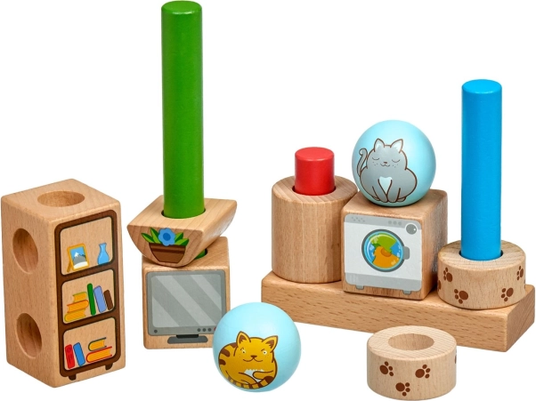 Træpuslespillet Legesyge katte bringer legende læring gennem stabling af farvede former på en base med pinde. Med 24 opgavekort prøver børn forskellige opstillinger og lærer at opfatte rum, former og farver. Kvalitets trækonstruktion og sikre farver sikrer lang holdbarhed og behagelig leg.