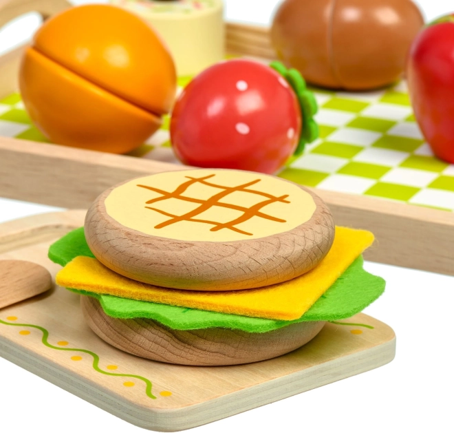Sættet indeholder alt til små kokke: bakke med ternet mønster, skærebræt, kniv, saltbøsse og peberkværn samt et farverigt udvalg af madvarer – brød, ost og salat, æg, banan, æble, appelsin, jordbær og en lille kage. Fokus på kvalitetsmaterialer og holdbar udførelse garanterer lang levetid og sikker leg.