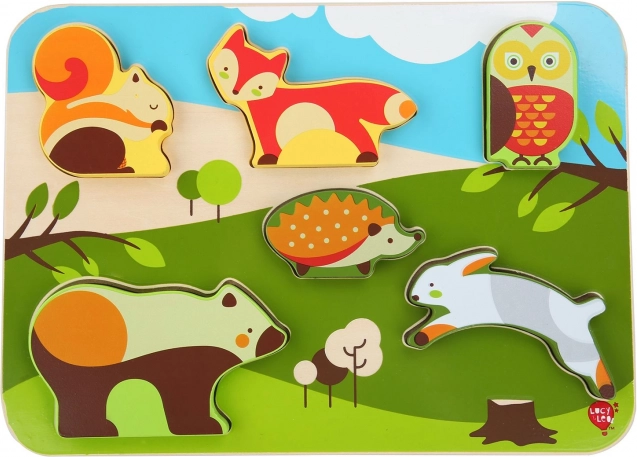 Lucy & Leo indsats-puslespil med skovdyr indeholder 7 farverige træbrikker uden knopper, som børn nemt kan gribe og lægge i de passende felter. Hver brik er tilstrækkeligt tyk til at kunne stå selvstændigt, hvilket udvider lege- og fantasi-mulighederne.