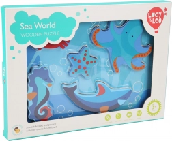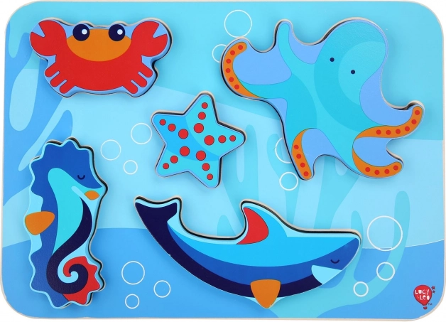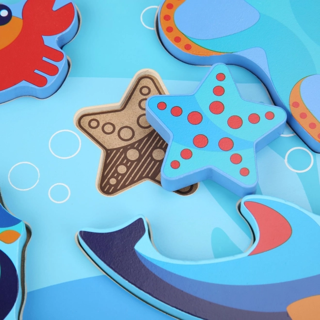 Dette træpuslespil med havdyr er designet til læring gennem leg. Seks farverige brikker – for eksempel blæksprutte, søstjerne og søhest – passer præcist i de udfræsede former på den robuste plade med oceanmotiv. Brikkerne er store nok til at ligge godt i hånden og kan takket være deres tykkelse også stå selv.