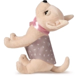 Hunden har en dragt med velcrolukning og en dekorativ sløjfe under halsen, hvilket øger den samlede attraktivitet. Den er velegnet til børn fra 3 år. Materialerne, der er brugt i produktionen, omfatter plys, tekstil og plast, hvilket gør legetøjet både behageligt at røre ved og let at vaske ved 30°C.