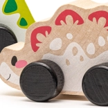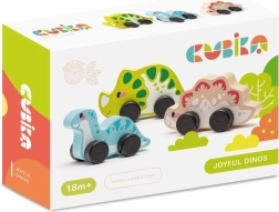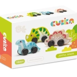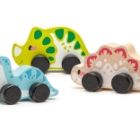 Sættet indeholder tre trædinosaurer med hjul for nem bevægelse, ideelt til små børn.