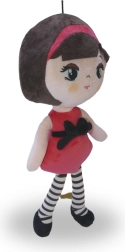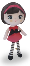 Dukken er klædt i en rød kjole med sort sløjfe, som fanger opmærksomheden.