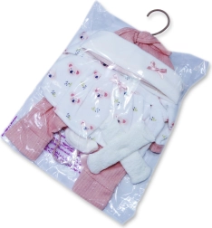 Det fire-delte sæt indeholder hue, overdel/kjole, bukser og sokker i matchende farver, så dukken altid er fint koordineret og dejligt varm.