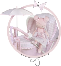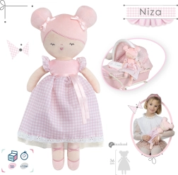 Plysbamse-dukken Niza i sarte rosa nuancer vil betage enhver lille modeelsker. Takket være den bløde, glatte og skinnende overflade er den ideel både til sengen og på rejser. Ensfarvet rosa kombineret med en fin rosahvid tern giver dukken et elegant, moderne look inspireret af spansk design.