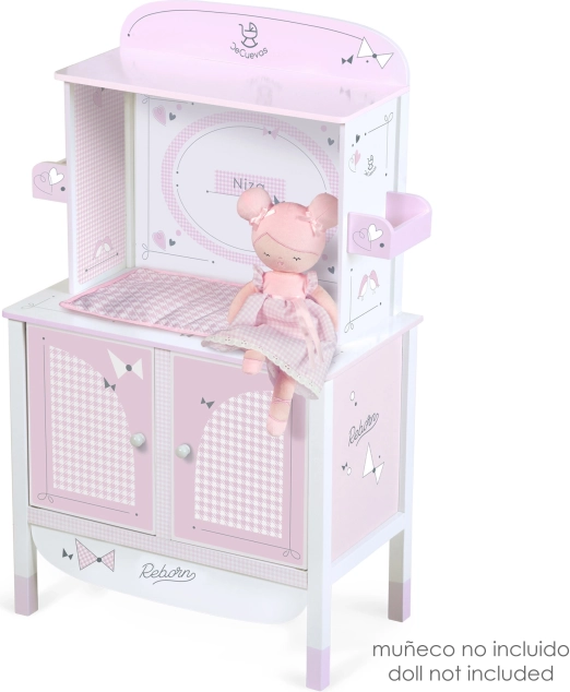 Takket være præcist spansk design og omhyggeligt udvalgte materialer virker skabet let og rent. De praktiske mål sikrer stabilitet og god plads til alt nødvendigt udstyr til pleje af dukker op til 45 cm.