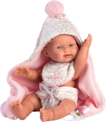 Dette todelte sæt er designet specielt til New Born-babydukke på 26 cm. Det indeholder et vendbart tæppe med hætte, som beskytter dukken og giver den et udseende som en rigtig baby.