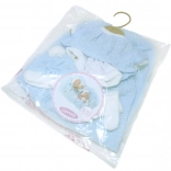 Elegant 4-delt tøjsæt til dukken New Born i størrelse 35-36 cm inkluderer et dekorativt tæppe med sløjfe. Perfekt sæt til leg og styling af din dukke.