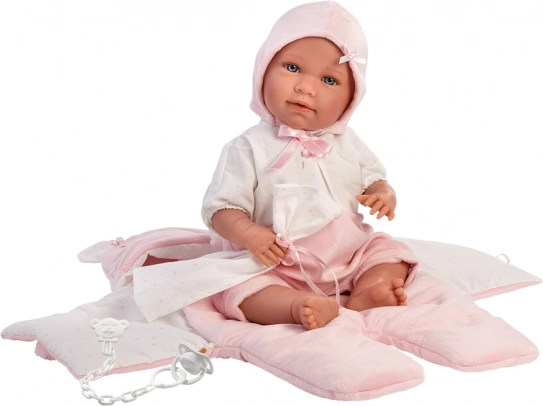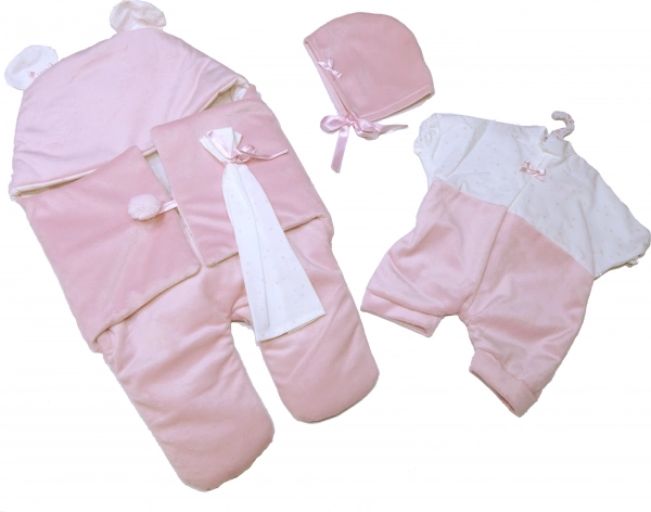 Dette vidunderlige tøjsæt til dukker er fremstillet i Spanien og inkluderer en todelt sæt, der er ideelt til dukker NEW BORN i størrelse 40-42 cm. Sættet leveres med en fløjlshurtigsvøb til autostol og dekorativt lommetørklæde, hvilket giver dukkerne et realistisk udseende.