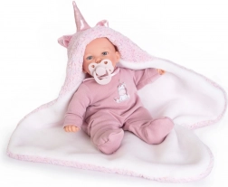 Den talende spanske dukke fra mærket Antonio Juan glæder med realistiske lyde – når man trykker den på maven, siger den “mor”, “far” og giver babylatter. Den har blød stofkrop, hoved og lemmer af blød vinyl, måler 27 cm, leveres i en gaveæske og er egnet til børn fra 3 år. Der medfølger 3× LR44.