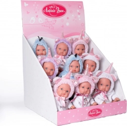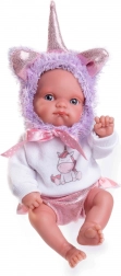En stilfuld hætte med lyserødt horn og ører, suppleret med en T-shirt med enhjørningeprint, giver dukken et magisk udseende.