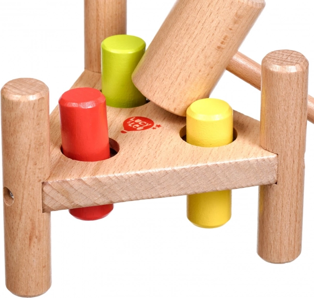 En sjov træbankebænk i en utraditionel trekantform, der styrker finmotorik, øje–hånd-koordination og koncentration. De tre farvede pinde er lette at banke i med den lille træhammer, og når de er banket i, er det bare at vende stativet og så kan legen begynde igen.