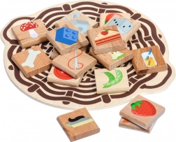 Denne gennemtænkte Montessori-hjælpemiddel lærer børn at skelne mellem, hvad der er egnet at spise, og hvad der ikke er. På træpladerne er der afbildet en tallerken med ske og en flettekurv, hvor børn lægger brikker med billeder af frugt, grøntsager, søde sager eller drikkevarer, men også nøgler, pærer, nåle eller blyanter. Legen understøtter naturligt verdensforståelse, koncentration og kommunikative færdigheder.