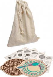 Pakken indeholder også 4 sort-hvide forlæg til hurtige iagttagelseslege og træning i sortering. Brikkerne kan efter leg opbevares i en lukkbar linnedpose, så intet bliver væk. Træelementerne har glatte kanter og klare, letforståelige illustrationer for nem genkendelse, inklusive lumske eksempler som svampe – nogle spiselige, andre uspiselige.