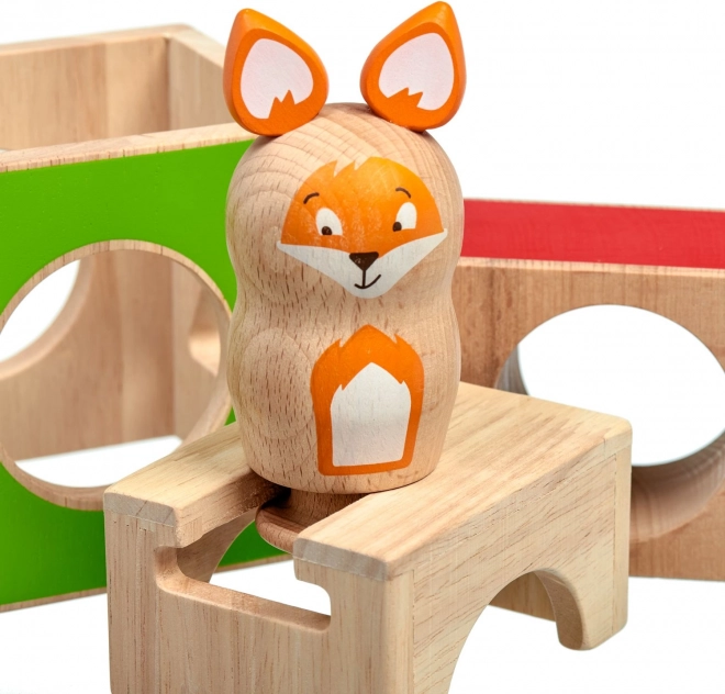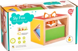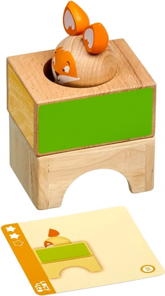 Dette pædagogiske træspil indeholder tre massive klodser med udskæringer i forskellige former, en træfigur af en ræv og et sæt dobbeltsidede opgavekort i varierende sværhedsgrad. Børn bygger og kombinerer klodserne efter forlæg, så ræven “skjuler sig” korrekt, hvorved de træner strategi og rumlig opfattelse.