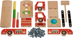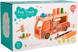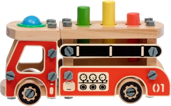 Dette kreative sæt kombinerer byggesæt og bankebænk i ét. Børn samler først en robust træbrandbil og bruger derefter fire huller på ladet til sjov bankning af farvede elementer med hammer. Takket være klare farver og varierede former understøtter legetøjet naturlig læring og koncentration.