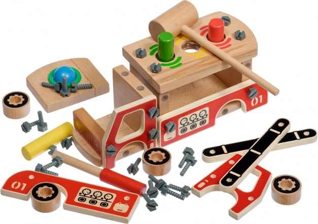 Samle en funktionel træbrandbil med skruer og værktøj. Byggeprocessen understøtter logisk tænkning og tålmodighed.