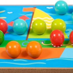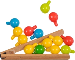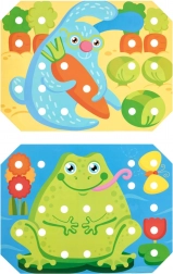 • Pakkens indhold: 70 træpinde, 1 pincet, 12 dobbeltsidede kort med dyremotiver, træbase med huller, 4 farvede snore, linnedpose.