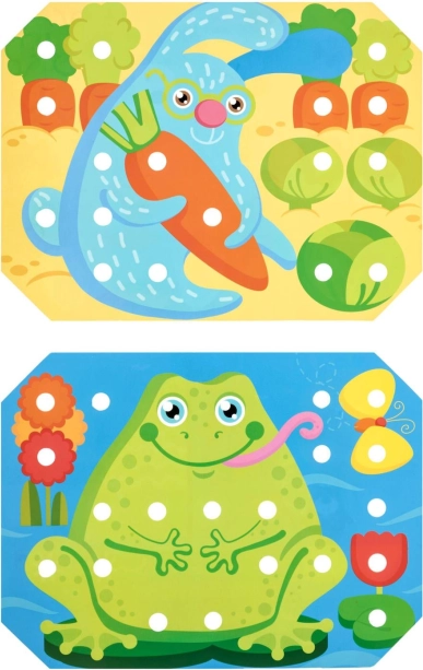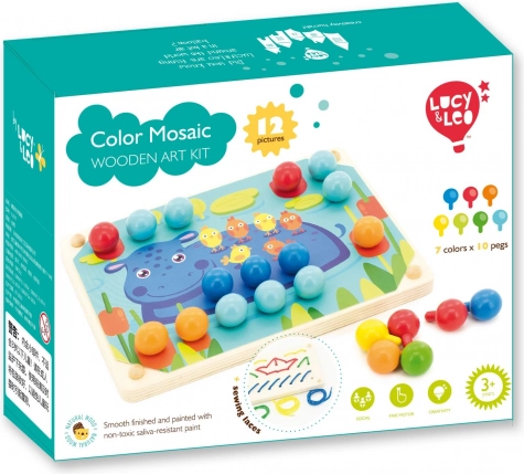Opdag et kreativt træsortiment for børn fra 3 år, som udvikler finmotorik, hånd-øje-koordination, farvegenkendelse og tålmodighed. Sættet indeholder 70 store farvede pinde, en pincet, 12 dobbeltsidede skabeloner med dyremotiver, en træbase med huller og 4 farvede snore til brodering – et ideelt Montessori-inspireret læringsredskab til legende læring.