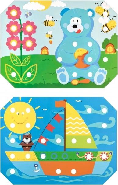 Børn vælger en af de farverige skabeloner, lægger den på træbasen og udfylder motivet med pinde ved hjælp af pincetten eller hænderne. De kan også øve snøring og brodering med de medfølgende snore. Legen understøtter naturligt koncentration, logik, tålmodighed og præcision.
