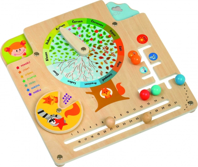 LUCY & LEOs træ naturkalender er et ideelt redskab til legende læring. I midten af pladen finder du et løvtræ med frugt og en markør for 12 måneder, så børnene let kan forbinde vinter med sne, forår med blomster, sommer med frugt og efterår med faldende blade. Samtidig lærer børnene at kende ugedage, antal dage i måneden, vejret, temperatur og passende påklædning til forskellige forhold.