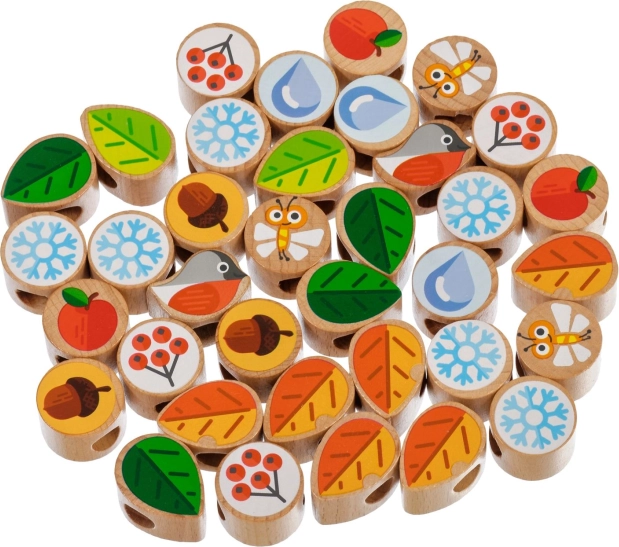 Dette kvalitets træ-sæt giver børn sjov snøring og træksyning på en solid træplade med stander. Sættet indeholder farvede brikker (blade, blomster, bær, agern, frugter, snefnug, insekter m.m.) og flere snore til uendelige variationer. Brikkerne kan efter leg opbevares i den praktiske linnedpose.