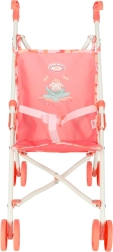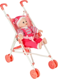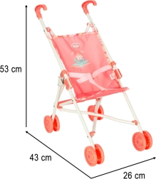 Sammenklappeligt design - Dukkevognen kan nemt foldes til kompakte dimensioner, hvilket gør det lettere at transportere og opbevare den. Det søde motiv på sædet og sikkerhedssele tilføjer autenticitet til legen. Dukkevognen bringer ikke kun glæde, men udvikler også barnets fantasi, empati og sociale færdigheder.