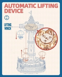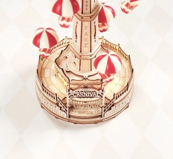 Dette raffinerede 3D træpuslespil er inspireret af det klassiske faldtårn fra forlystelsesparker. Den sekskantede base og de sidevendte, gennemskinnelige vinduer lader et varmt lys skinne igennem og understreger den unikke atmosfære. Karussellen drives af en batterimotor og oplyses af LED-lys, mens berøringsstyring gør det muligt at styre bevægelse og lyd uafhængigt.