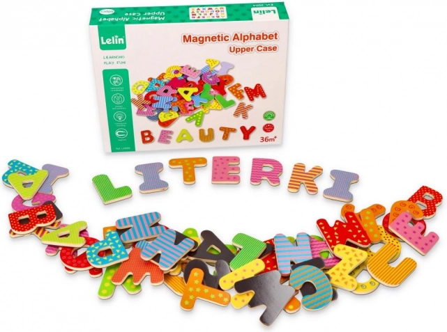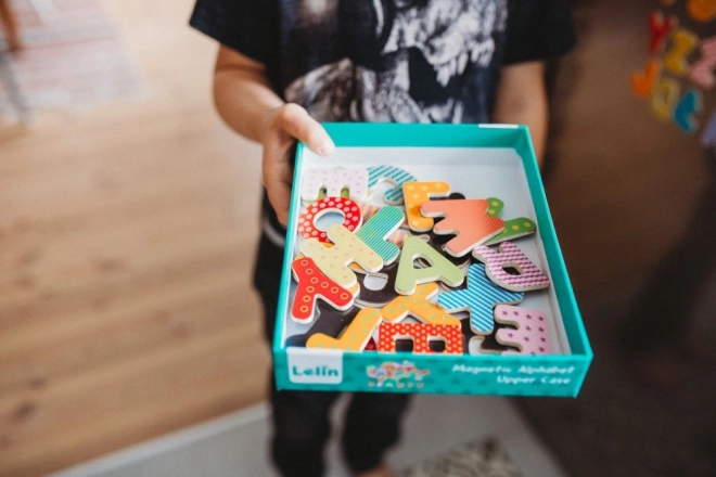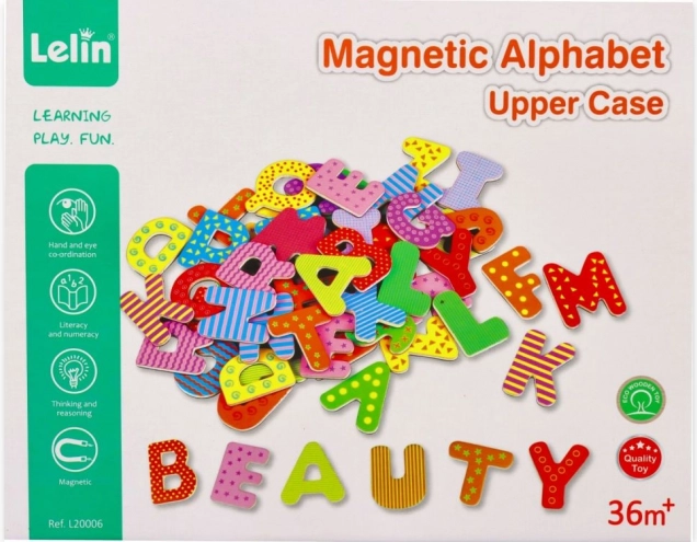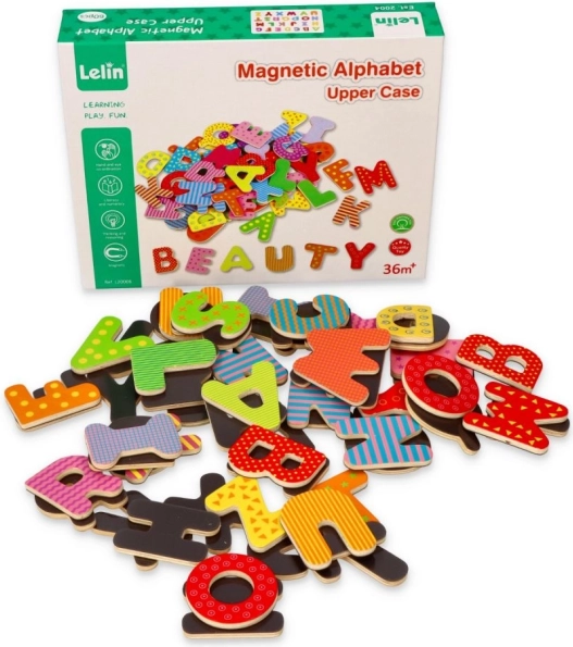 Dette sæt magnetiske træbogstaver understøtter naturlig læring gennem leg. Takket være den magnetiske bagside hæfter de på køleskabe, magnettavler og metaloverflader, så børn nemt kan lære alfabetet, at sætte stavelser sammen og danne deres første ord.