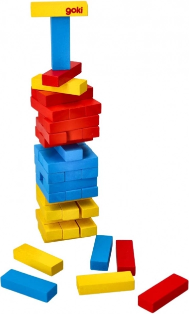 Dette klassiske balancespil i kvalitetstræ fra GOKI har enkle regler, men maksimal sjov. Hvert niveau består af tre farvede klodser, og spillernes opgave er forsigtigt at skubbe klodser ud fra de nederste lag og lægge dem øverst. Tårnet skal blive stående – vinderen er den, der bevarer balancen længst.