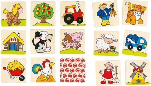 Opdag det klassiske vendespil i en charmerende landbrugsudgave. Når børn leder efter par, træner de hukommelse, logisk tænkning og visuel perception, samtidig med at de lærer at genkende dyr og genstande fra gården. Takket være den solide udførelse egner spillet sig til daglig leg både hjemme og på farten.