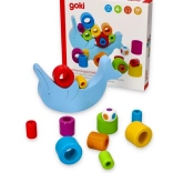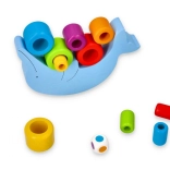 Sættet indeholder en delfin lavet af høj kvalitets træ og 18 farvede ringe, som skal stables strategisk. Den medfølgende terning tilføjer en ekstra sværhedsgrad og underholdning ved at bestemme rækkefølgen, hvor ringene stables.
