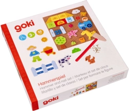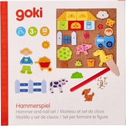 Dette originale Goki Lege med Hammeren bringer timevis af sjov og kreativitet til børnene. Sættet indeholder i alt 52 dele - trætede former, søm, korkplade og hammer, hvilket muliggør skabelse af forskellige billeder med dyr, bondegårde og andre motiver.