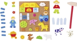 Legetøjet understøtter finmotorik og kreativitet hos børn fra 3 år. Børn kan nemt fastgøre træformerne på korkpladen med hammer og søm og derefter tage det hele fra hinanden igen for nye kreative eventyr.