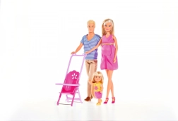 Sættet Steffi Happy Family indeholder 3 dukker: den gravide Steffi, Kevin og lille Evi i barnevogn.Der medfølger også mere end 19 tilbehørsdele.