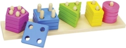 Det sjove træpuslespil kombinerer sortering af farver og former med at træde brikker med forskelligt antal huller ned over pinde. Det udvikler finmotorik, øje-hånd-koordination og logisk tænkning, og er fremstillet af massivt træ for sikker og holdbar leg.